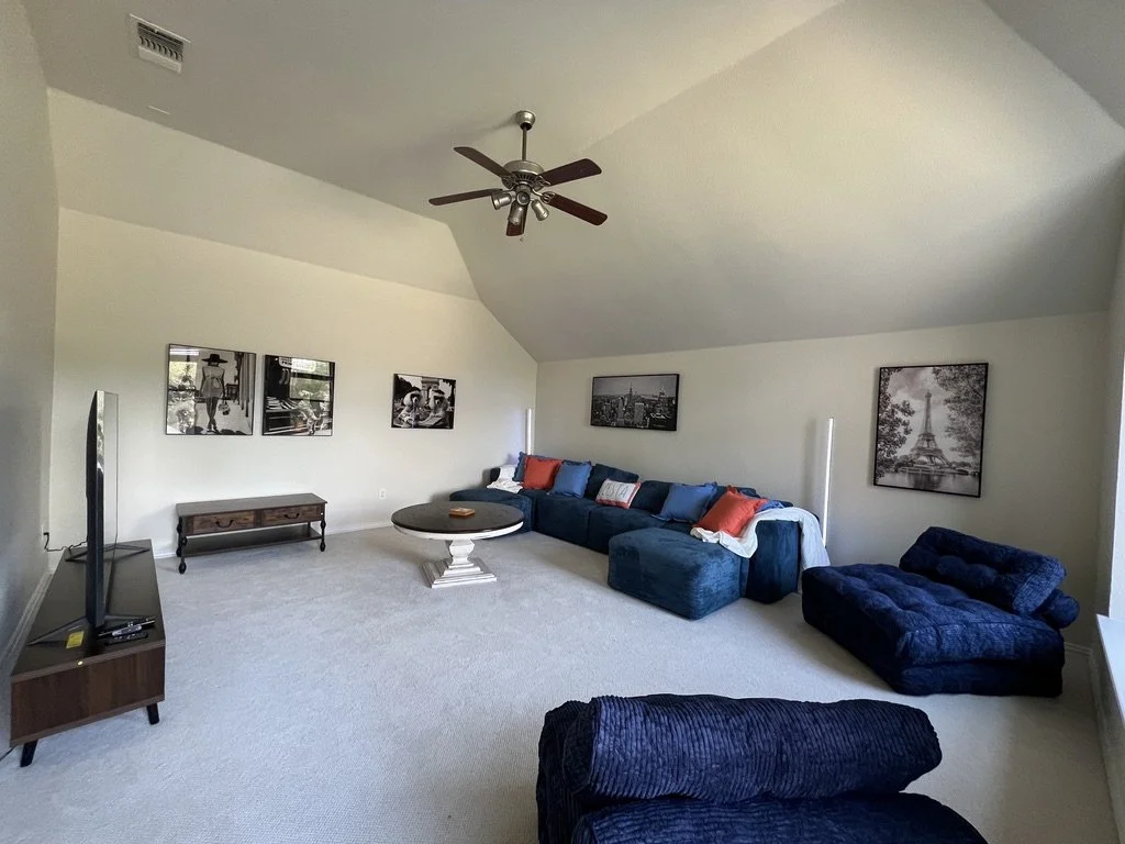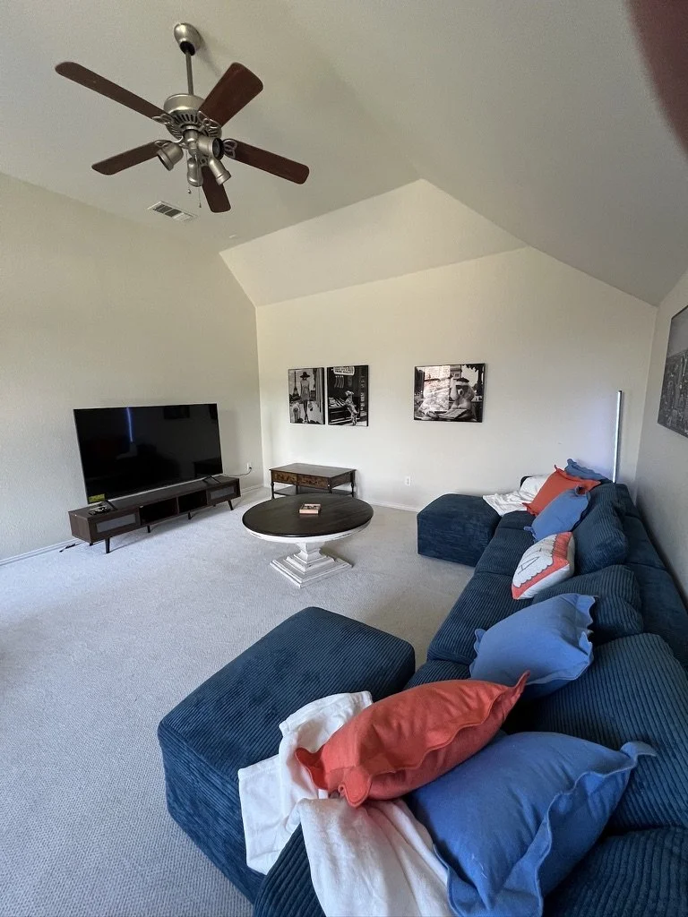 Bright living room with vaulted ceiling, ceiling fan, wall art including the Eiffel Tower, large dark blue sectional sofa with colorful pillows, matching chaise lounge, wooden TV stand with flat-screen TV, and a round coffee table on light-colored ca