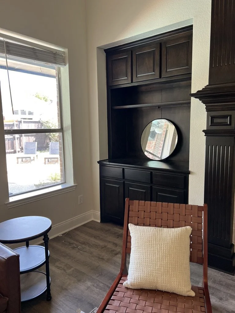 Corner of a room with a large window, a black built-in cabinet with a round mirror, a brown woven chair with a cream pillow, and a small black side table.