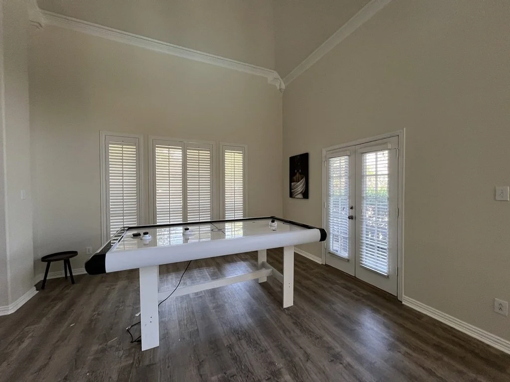 Empty room with hardwood flooring, white walls, and large windows with blinds. A small black stool is in the corner, and a double-door with blinds leads outside. An air hockey table is in the center.
