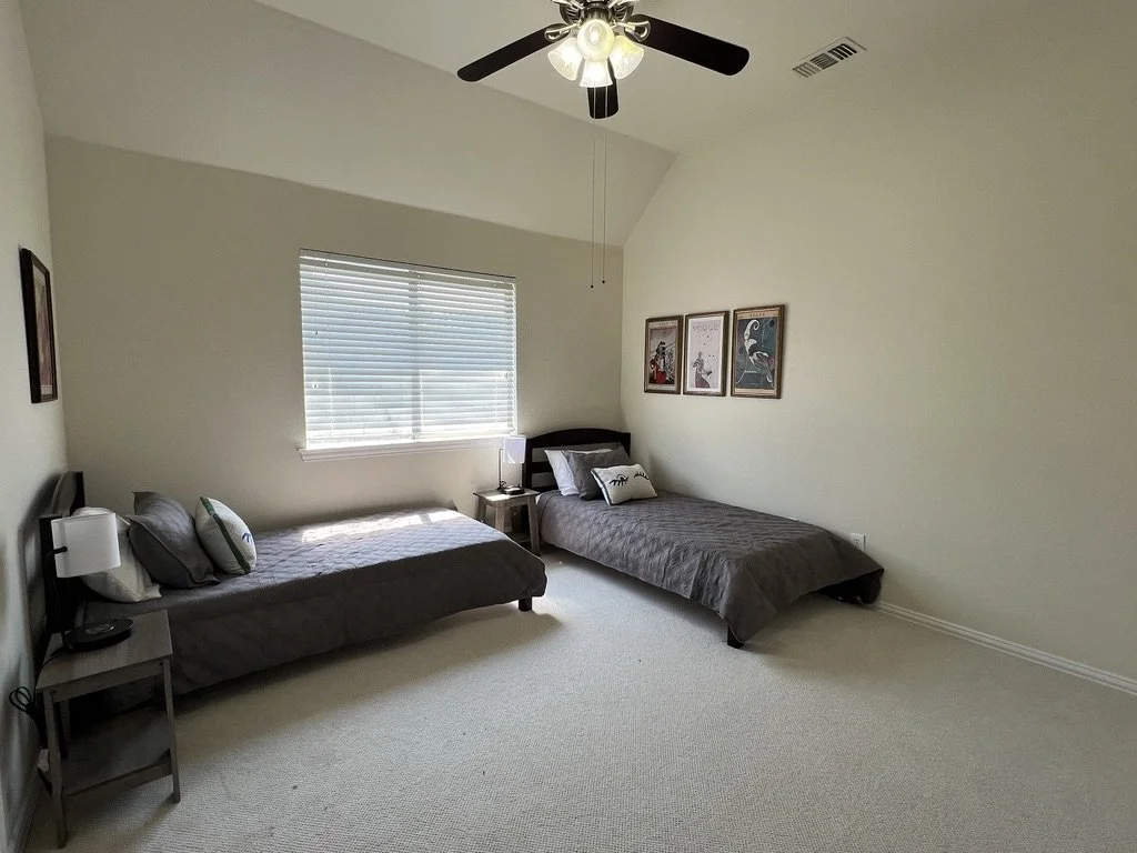 A bedroom with two single beds, a window with blinds, a ceiling fan with lights, and three framed pictures on the wall.