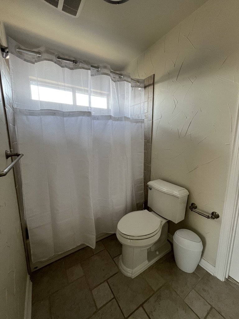 A small bathroom with a toilet, a shower with a curtain, a window, and a trash can.