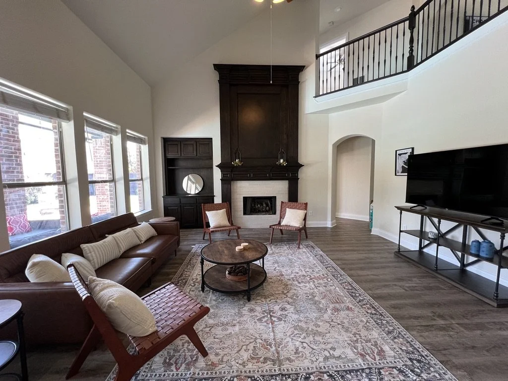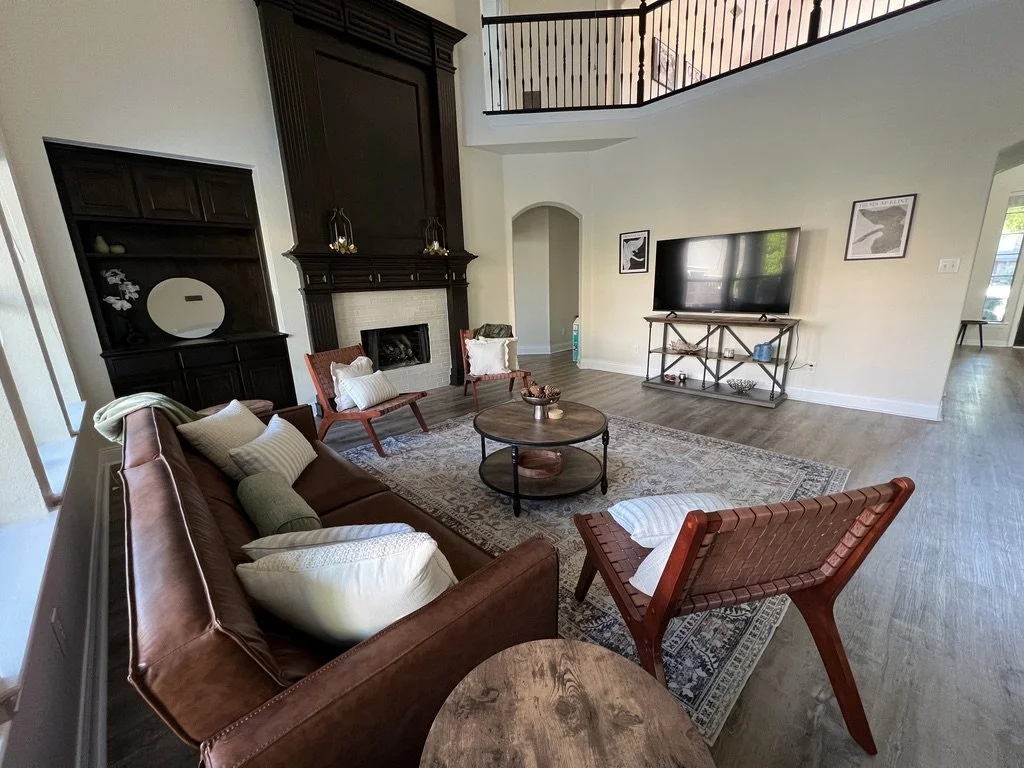 Living room with brown leather sofa, wooden armchairs, a fireplace with a dark wood mantel, large windows, and a flat-screen TV on a shelf, with a high ceiling and a second-floor balcony.