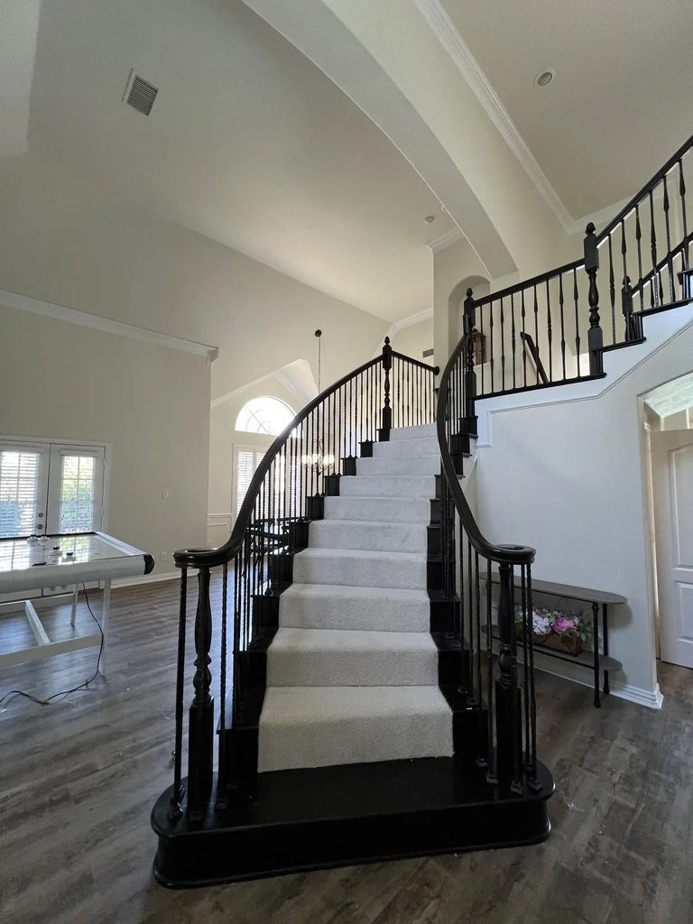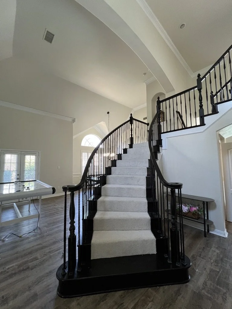 Interior view of a grand staircase with a curved dark wooden banister and white carpet runner, in a spacious, well-lit house with high ceilings and hardwood floors.