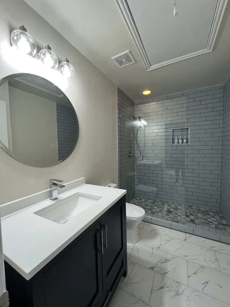 Modern bathroom featuring a white vanity with a black cabinet, a round mirror, a toilet, and a glass-enclosed walk-in shower with gray subway tiles and pebble tile flooring.