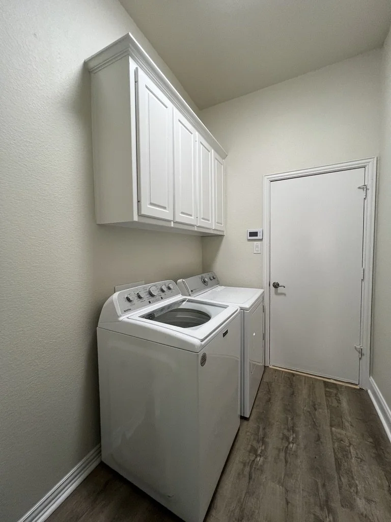 A laundry room with a washing machine and dryer, white cabinets above, and a door on the right side.