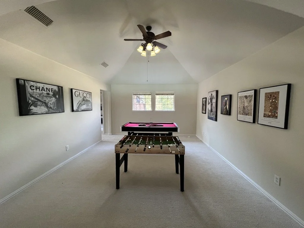 A game room with a foosball table and a pool table, decorated with framed posters and pictures, lit by a ceiling fan with lights, and two small windows in the background.
