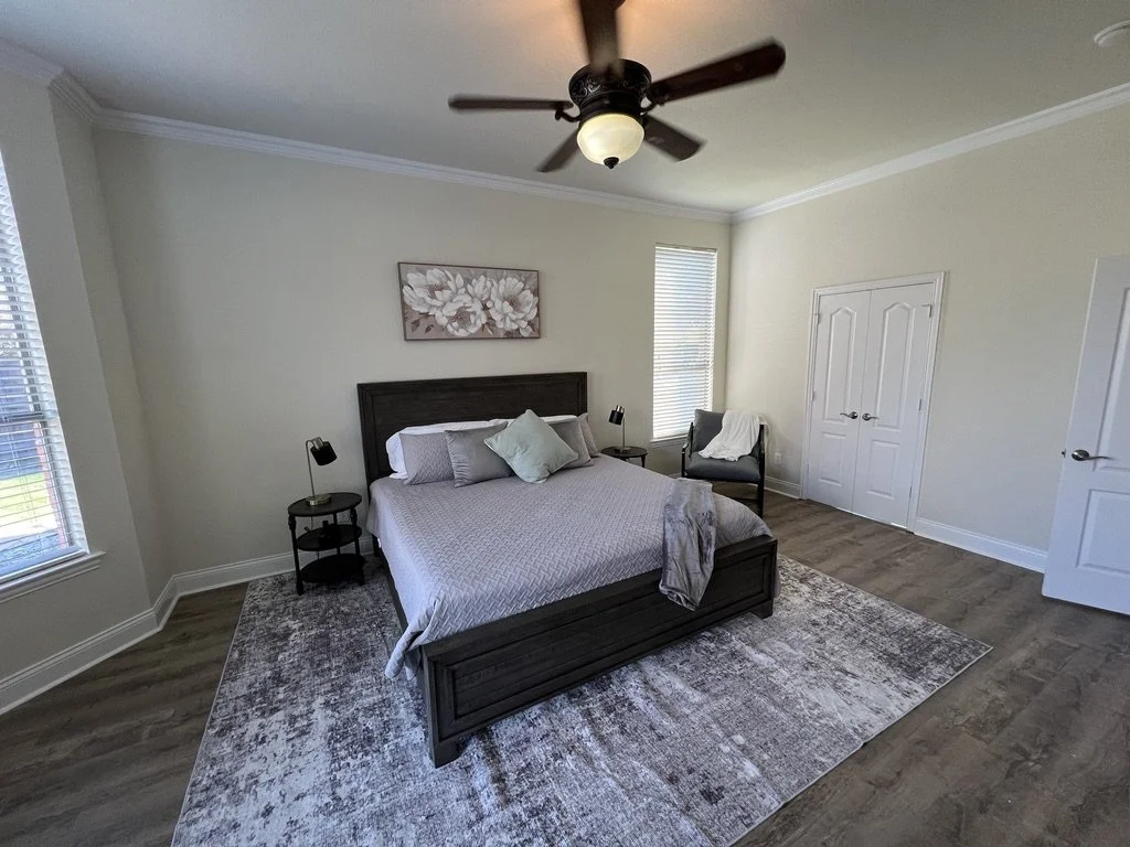 Bedroom with a bed, two black nightstands, two black lamps, a gray armchair with a white throw, a floral wall art, a ceiling fan, two windows with blinds, a double closet door, a white outer door, and a gray area rug on wood floor.