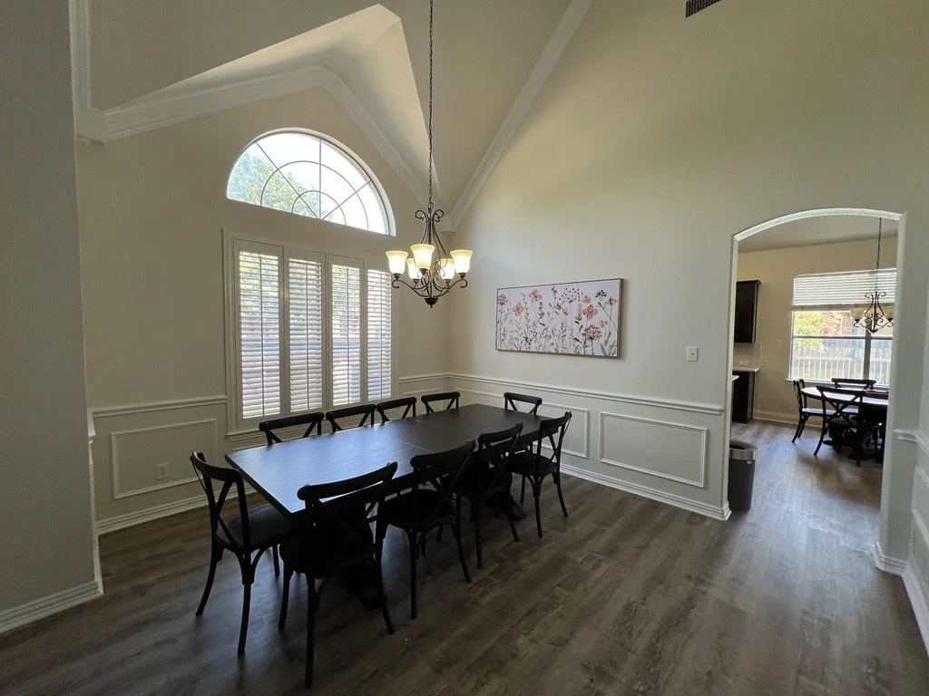 Dining room with a large rectangular table, ten chairs, a chandelier, and a half-circle window with shutters.