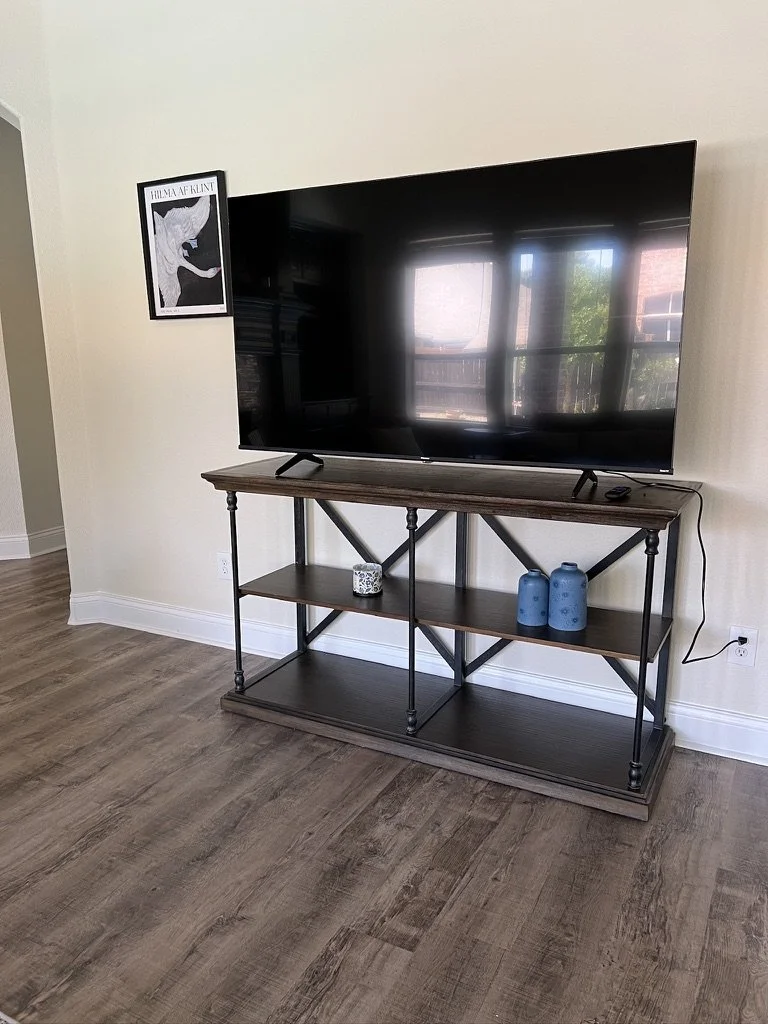 Large flat-screen television on a modern console table with decor items and a remote, in a living room with hardwood flooring and a window reflecting outside scenery.