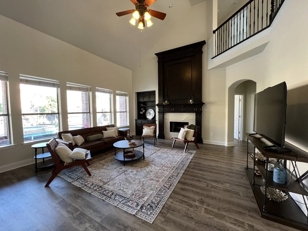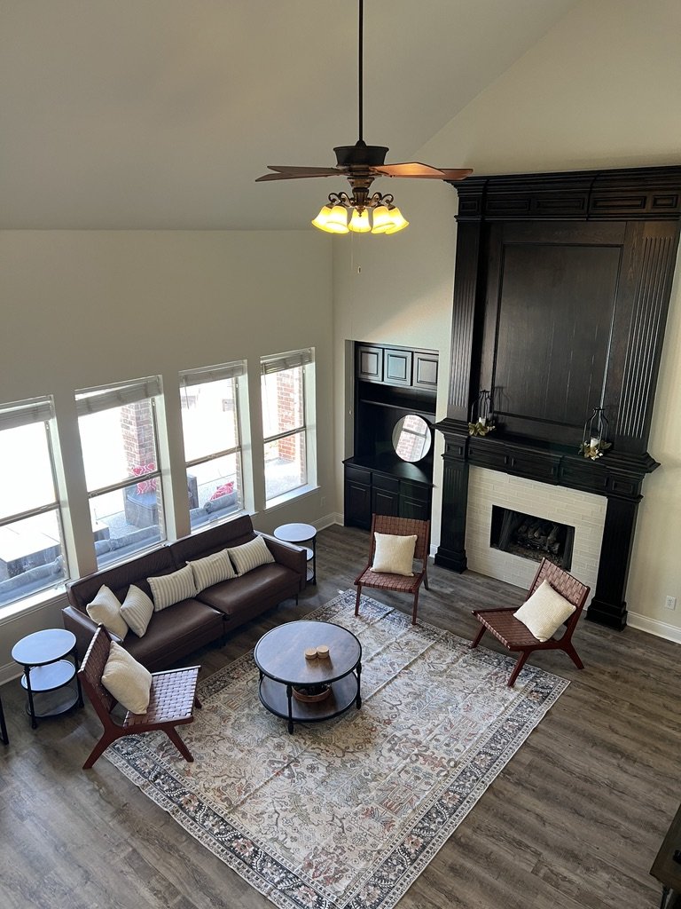 A spacious living room with large windows, a dark wood fireplace, and a high ceiling with a ceiling fan. There is a large brown sofa with white pillows, a round coffee table, and two armchairs. A television is on a stand to the right, and a decorativ