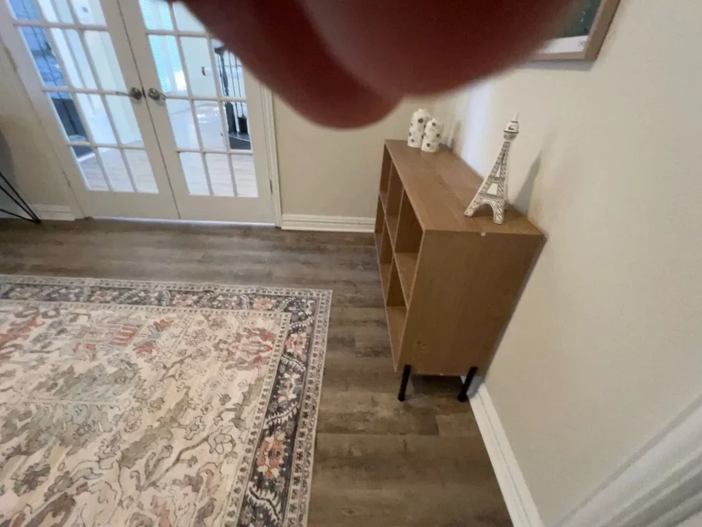 A room with a wooden bookshelf and decorative items on top, including a small Eiffel Tower replica, against a beige wall with French door leading to outside patio.