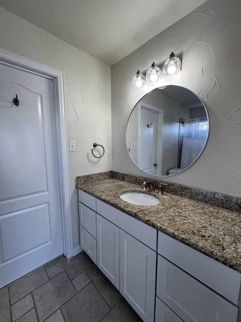 Bathroom vanity area with a granite countertop, white cabinets, a round mirror, three light bulbs above the mirror, a wall-mounted towel ring, and a white door.