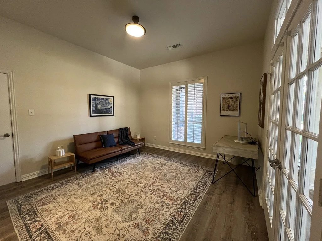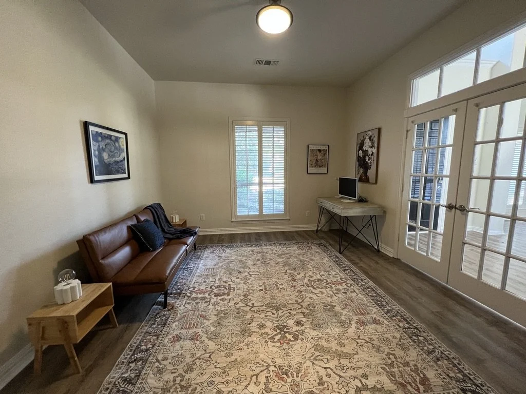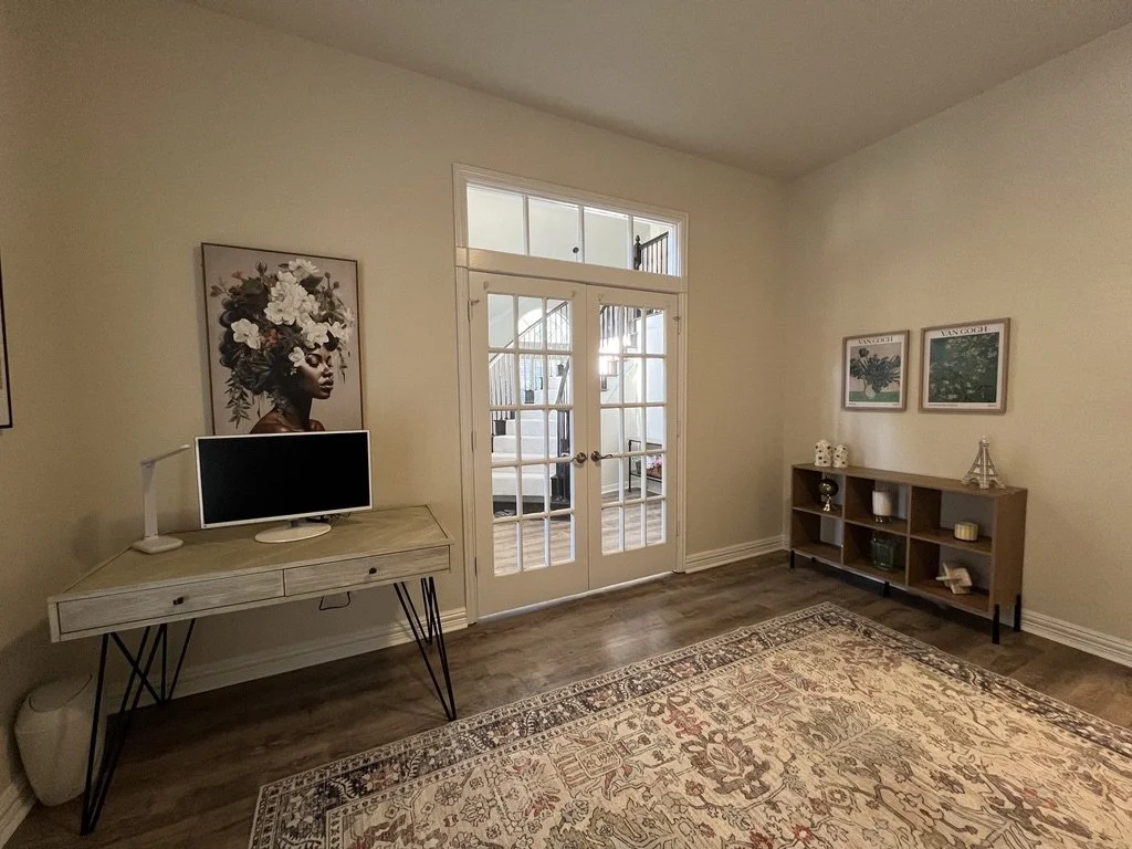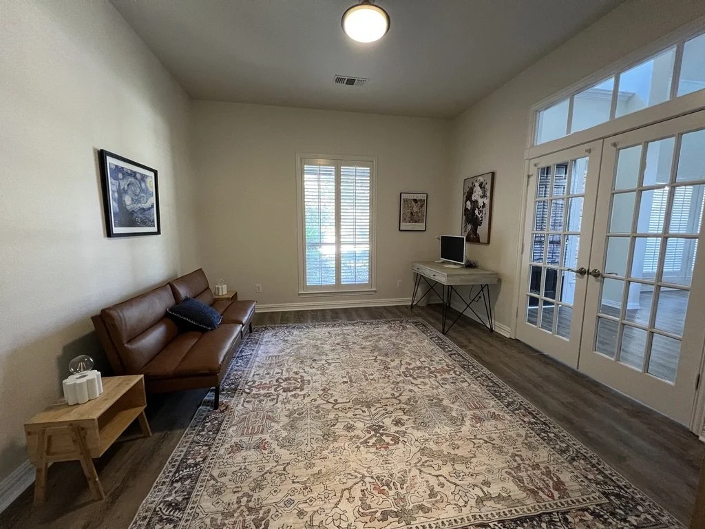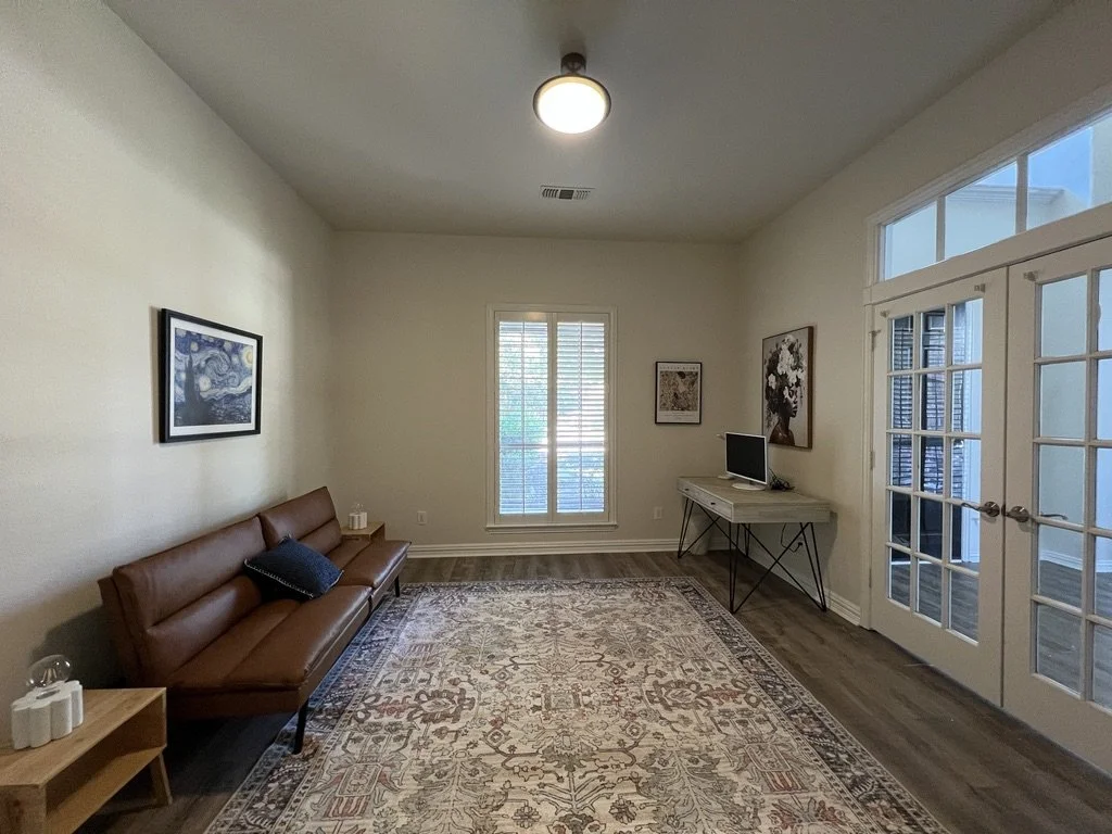 Living room with a brown leather couch, a small wooden side table, a patterned area rug, a desk with a computer, framed artwork on the walls, and French doors leading to an outdoor space.