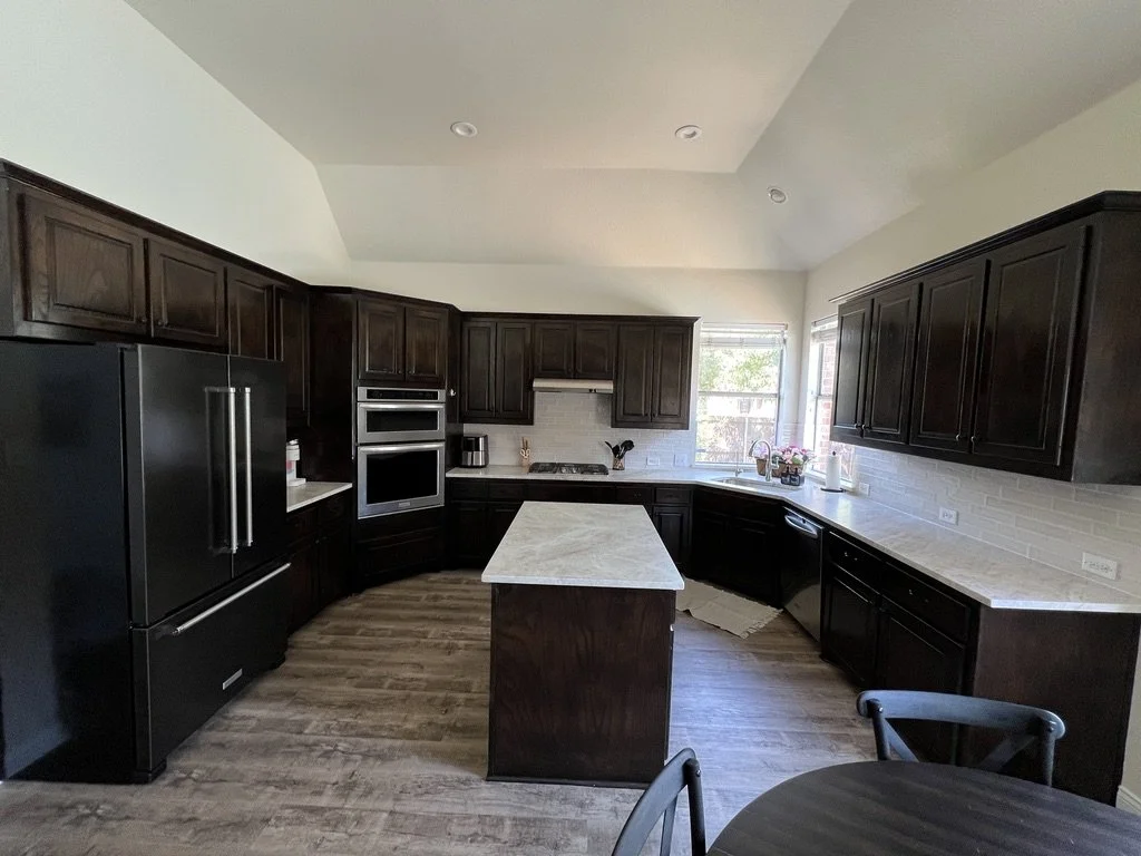 A spacious kitchen with dark wooden cabinets, black appliances including a refrigerator and double oven, a marble kitchen island, and a window above the sink with a view outside.