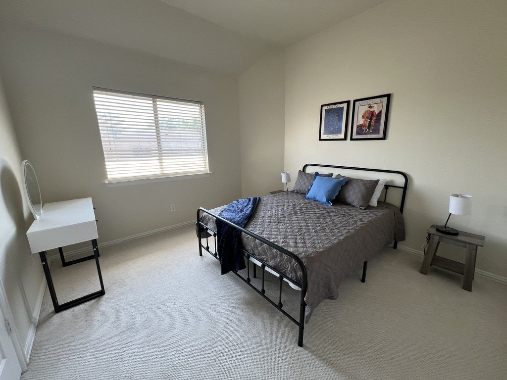A bedroom with a dark wooden bed, light-colored bedding, and pillows. There are two black bedside tables with lamps, a window with blinds, a gray chair with a throw blanket, a white closet door, and a floral painting above the bed.