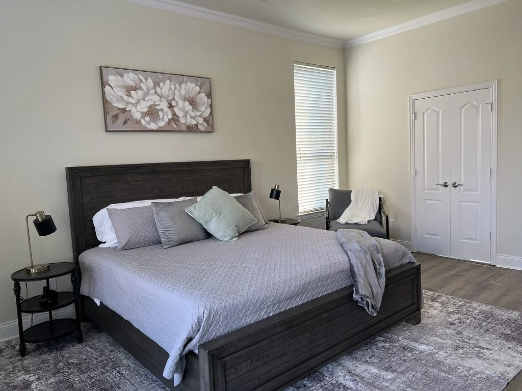 A bedroom with a large bed, dark wooden headboard, white and gray bedding, and pillows. There are two black bedside lamps, a chair with a white blanket, a window with blinds, a framed floral artwork above the bed, and a closet with double doors.