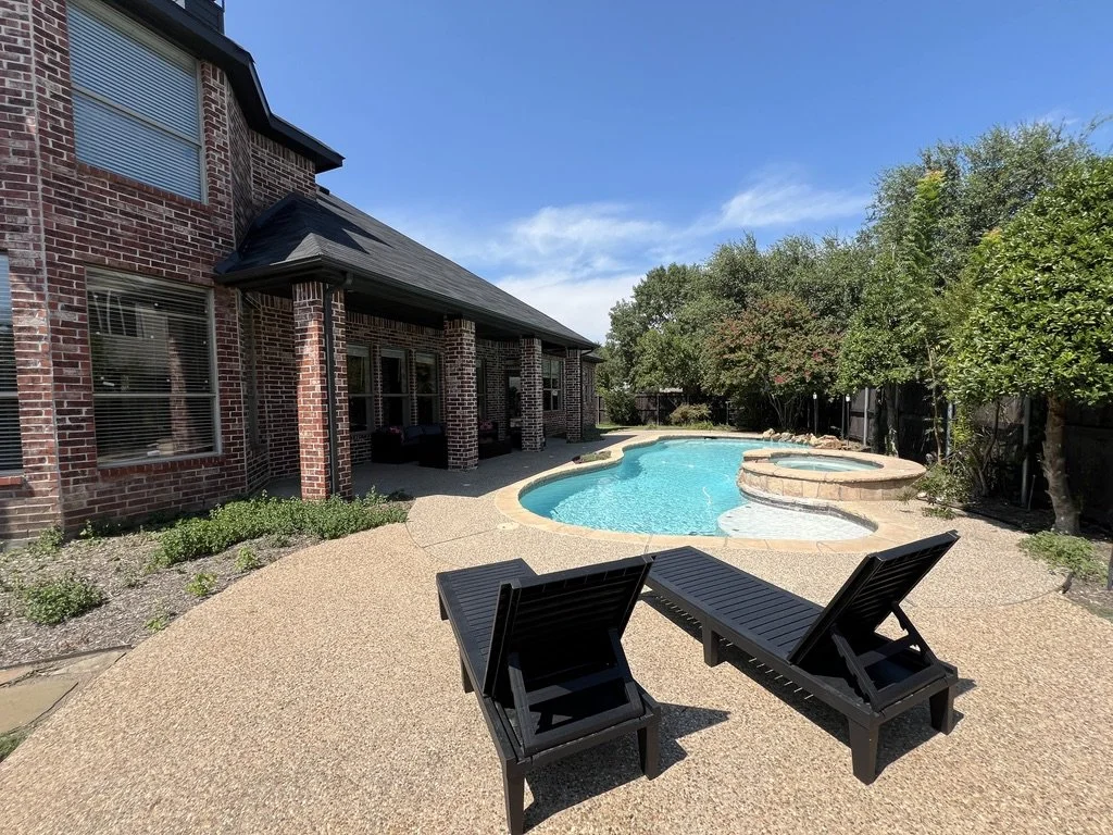 Backyard with a swimming pool, two black lounge chairs, and a brick house with multiple windows.