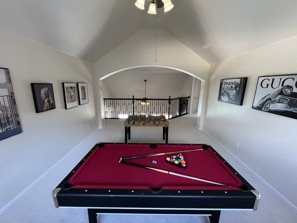 A basement recreation room with a pool table, foosball table, and framed art on the walls.