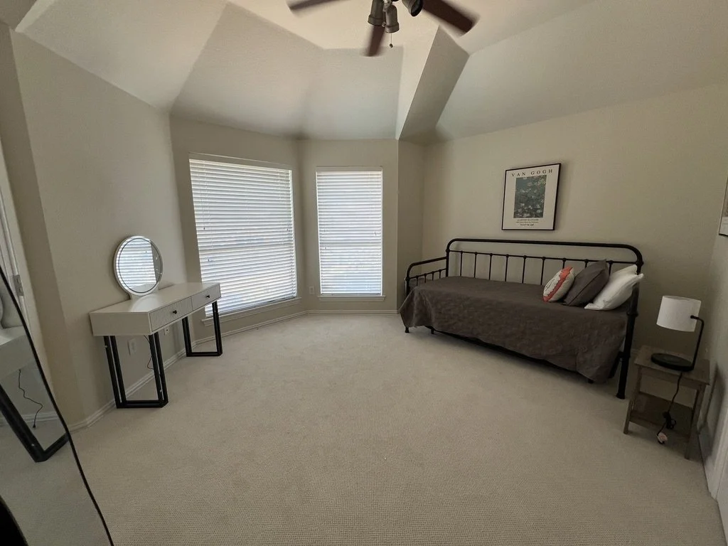A bedroom with beige walls and carpet, a black metal daybed with brown bedding and pillows, a framed artwork of Van Gogh on the wall, two windows with blinds, a small white vanity table with a round mirror, a side table with a lamp, and a ceiling fan