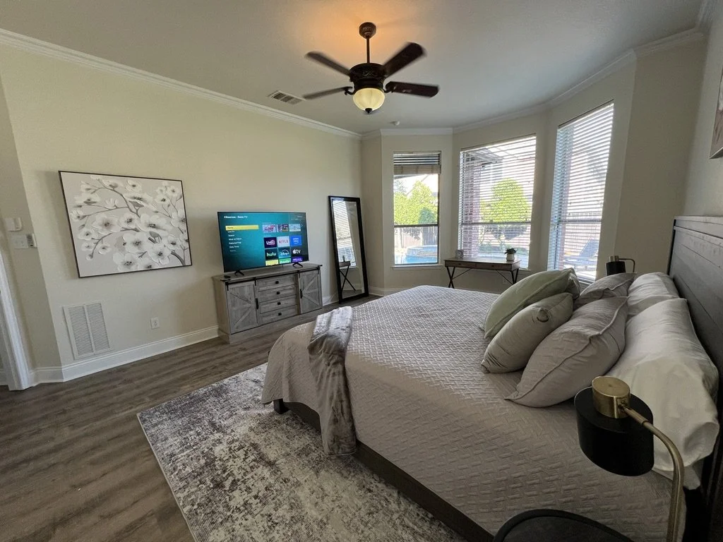 A bedroom with a large bed, decorative pillows, a bedside lamp, a dresser with a television, a mirror, windows with blinds, and a ceiling fan.